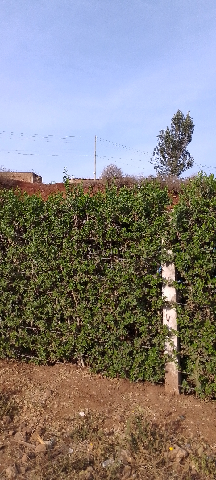 A dense green hedge stretches across the middle ground, partially obscuring a backdrop of brown earth and sparse vegetation. A concrete post punctuates the right side of the hedge. Above the hedge, a distant tree rises against a clear blue sky. Power lines and a pole are also visible. The foreground consists of dry, rocky soil with patches of green vegetation and some litter. A building with a barbed-wire fence is visible on the brown earth.