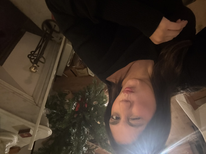 A woman in a black top winks at the camera. The image is rotated to the side. Behind her, there's a Christmas tree, a white mantle, and a floor lamp with decorative metalwork. The lighting is soft, creating shadows on the woman's face and the surrounding objects. The composition is casual and spontaneous, suggesting a candid moment captured on camera.