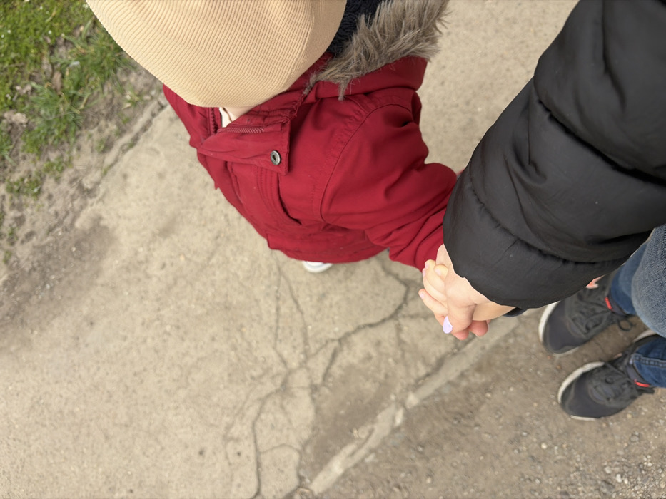 The image, captured from a high-angle perspective, shows two individuals holding hands on a cracked concrete path in Lom, Bulgaria. In the foreground, the lower body of an adult is visible, wearing a black padded jacket, blue jeans, and dark athletic shoes. Their right hand, adorned with light purple nail polish, grasps the left hand of a child. The child, partially seen from above, wears a red padded winter jacket with a fur-lined hood and a light beige ribbed beanie. The ground is a light-colored concrete surface with numerous visible cracks and scattered small debris. Sparse green grass and dirt are present along the upper right edge of the frame.