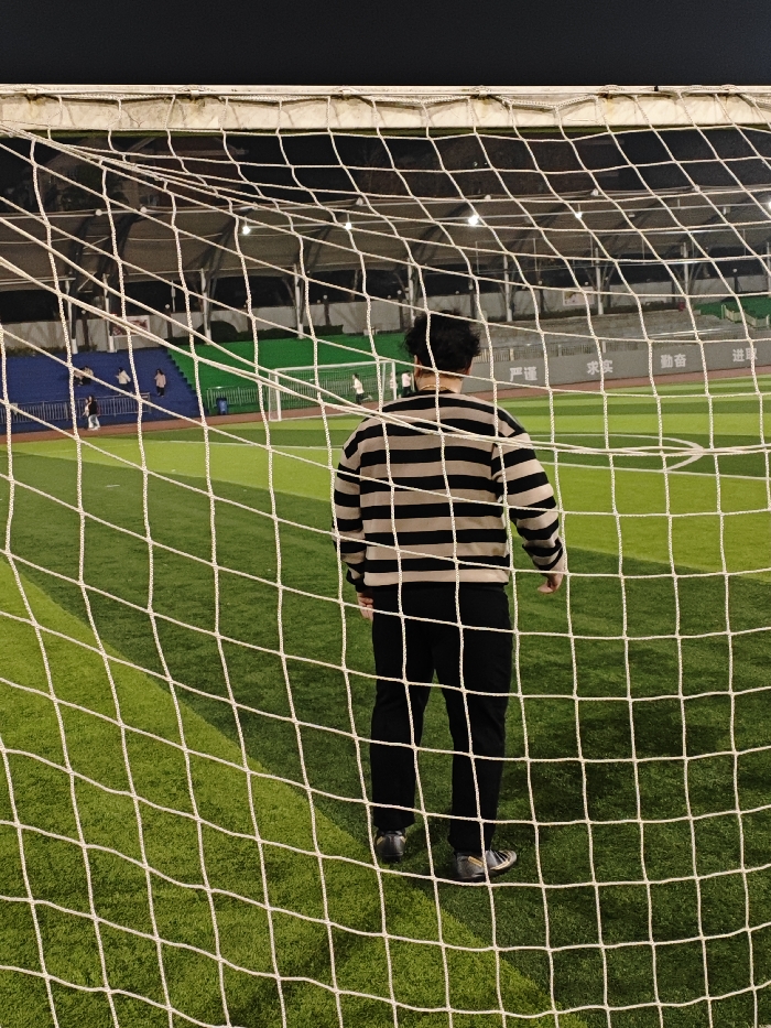 The scene depicts an artificial turf soccer field at night, illuminated by overhead lighting. A white soccer goal net, blurred and out of focus, occupies the immediate foreground. In the midground, a male individual stands with his back to the camera, wearing a long-sleeved horizontally striped top (black and light grey/beige), dark trousers, and dark shoes. He has dark, curly hair. He stands on the green artificial turf, which is marked with white lines. In the background, another white soccer goal structure is visible. Further back, elevated spectator seating areas are present, with a section of blue seating identifiable on the left. Several indistinct figures are visible in the background, both on the field and in the seating areas. A low wall or barrier in the distant background displays blurred Chinese characters reading "严谨", "求实", "勤奋", "进取". The sky above is dark. The location is the City of Unknown, Unknown.