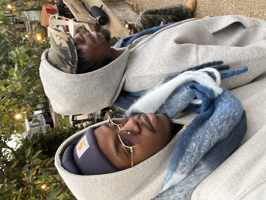 Two individuals are depicted in an outdoor urban setting within London, United Kingdom, characterized by lush green foliage and warm string lights. The person on the left, an adult male with dark skin, is positioned closer to the camera. He wears a light grey hooded sweatshirt with the hood pulled over his head, a dark blue Carhartt beanie visible beneath the hood, and gold-framed hexagonal glasses with lightly tinted lenses. A blue and white gradient fluffy scarf is wrapped around his neck. He has a neatly trimmed mustache and goatee and gazes towards the right side of the frame with a neutral expression. A thin gold chain is visible at his neck. The person on the right, also an adult male with dark skin, is situated slightly behind and to the right of the first individual. He wears a light grey hooded sweatshirt with the hood up, covering a camouflage baseball cap with a distressed brim. His dreadlocks are visible under the cap. He has a beard and is wearing camouflage trousers and light brown boots. He holds a yellow, cylindrical object in his right hand. He is looking towards the right with his mouth slightly open, suggesting speech or a reaction. A black cylindrical portable speaker is placed on a low, weathered concrete ledge to his right. The background consists of dense green foliage, likely trees or bushes, interspersed with illuminated warm-toned string lights. In the left distance, a light-colored truck, possibly a food or utility vehicle, is partially visible, along with a dark sign featuring white text. Various outdoor furniture, including white and red chairs and dark stools, are scattered in the mid-ground, suggesting an open-air seating area. The ground surface appears to be paved or gravel.