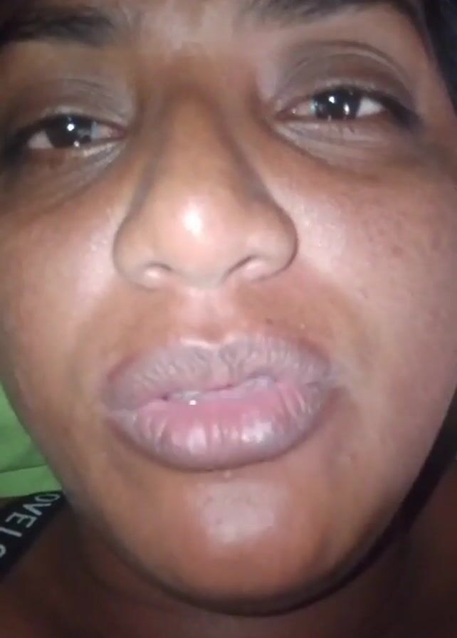 A close-up video shows a dark-skinned woman speaking directly to the camera. Her facial expression appears concerned or tired. Her lips are full and slightly parted, revealing her teeth as she speaks. Her eyes are dark and appear watery. Her skin has some visible blemishes or freckles. In the background, a dark or black material with white text is visible, possibly clothing. The overall lighting is dim.