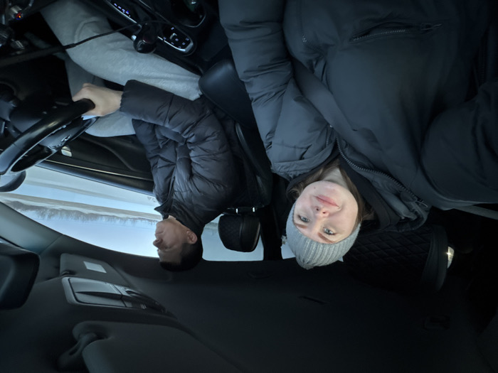 The image captures the interior of a moving vehicle with two occupants