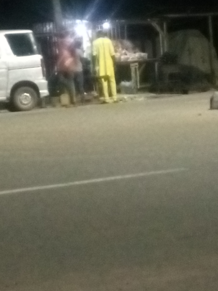 The image depicts an outdoor nighttime scene in Zango-ndaji, Nigeria. A paved roadway occupies the foreground, marked by a single white line. On the left side, the rear section of a light-colored van or minibus is parked. To the right, a group of individuals is gathered around a brightly illuminated roadside stall. A person wearing a full-length, bright yellow garment stands with their back to the viewer, facing the stall. Another individual, partially obscured and wearing a reddish-brown top, is positioned to the left of the person in yellow, near the parked van. The stall consists of a framework structure and displays various items on a surface, suggesting a commercial transaction point. Artificial light sources brightly illuminate the stall area.