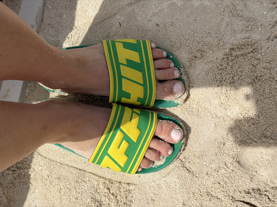 A bird's-eye view captures a pair of feet clad in green and yellow "FIT" branded slide sandals, resting on sandy ground