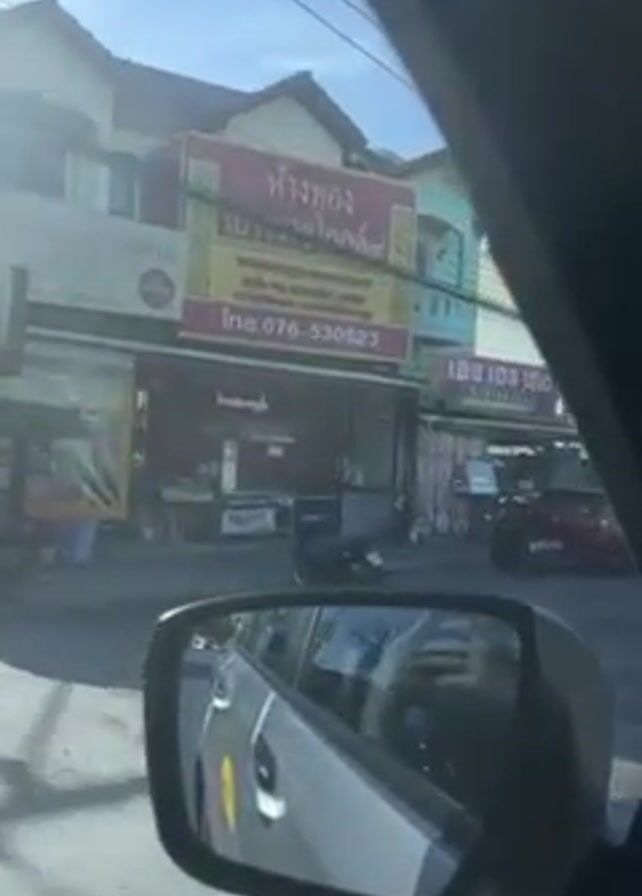 street scene from the perspective of a car passenger. The car is moving, and the view is through the side window and side mirror. Several buildings with signage in Thai and English can be seen, including what appears to be a gold shop, a restaurant with the words "Pizza Pasta & More," and another restaurant. Cars, motorcycles, and utility poles are also visible. The sky is clear and blue.