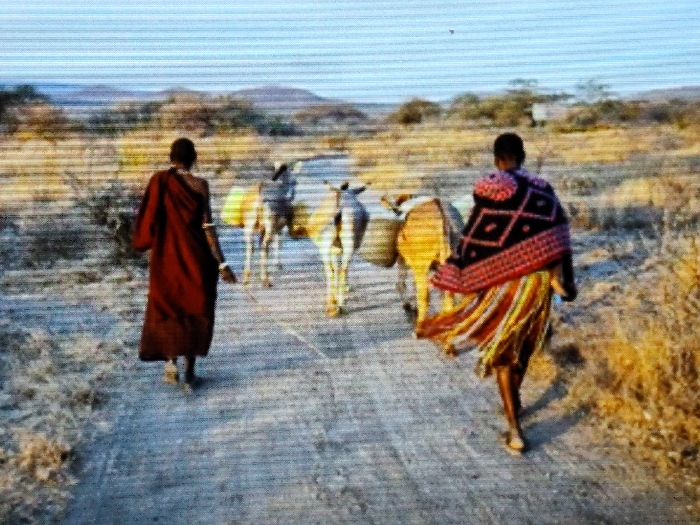 This image depicts a daylight scene on an unpaved dirt path in a rural area of the Dodoma region, Tanzania. Two individuals are walking away from the viewer, accompanying three donkeys. The person on the left wears a dark red robe or shuka. The person on the right wears a black, red, and white patterned shawl over a yellow and orange striped skirt, with sandals visible on their feet. Three donkeys walk in the center of the path, each laden with containers strapped to their backs, including yellowish and grey vessels. The immediate environment consists of dry grasses and sparse scrub brush. Distant low hills are visible against a pale blue sky in the background.