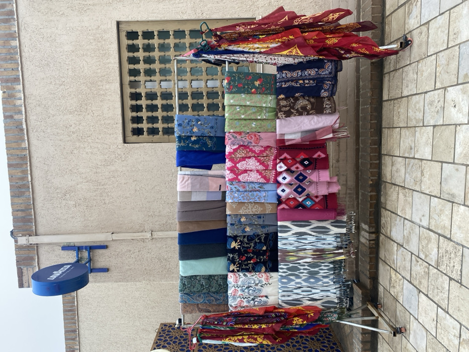 This image depicts an outdoor merchandise display in the city of Khiva, Uzbekistan