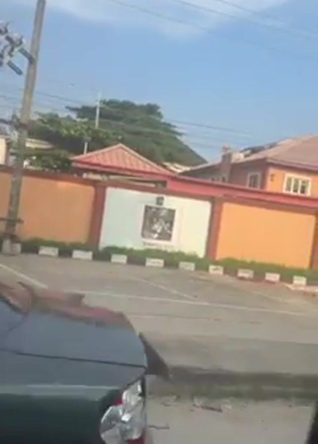 street scene from the interior of a moving car. Buildings with red roofs and fences are visible on either side of the road. Power lines run overhead. A motorcyclist pulls up alongside the car, then a person walks in front of the car. The car then drives past. The road is paved, but has debris on it. The sky is blue with some clouds.