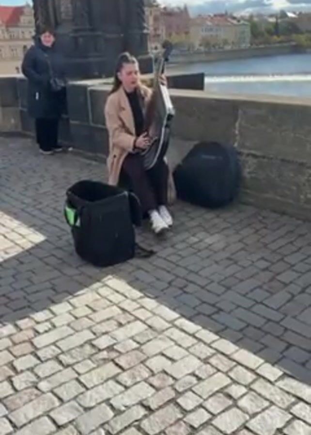young woman with long brown hair, wearing a beige coat and white sneakers, sitting on a low object on a cobblestone path. She is holding a dark-colored cello, and appears to be tuning it or getting ready to play. To her left is a large black soft-sided bag, and behind that, leaning against a stone wall, stands an older woman with short hair wearing a dark coat. Behind the performer are the gray stone walls of a bridge, and beyond that, the light blue waters of a wide river. In the distance are buildings in various colors. To the right of the performer is another dark-colored bag. The cobblestones are gray and light brown, and the sky is mostly blue with some clouds.