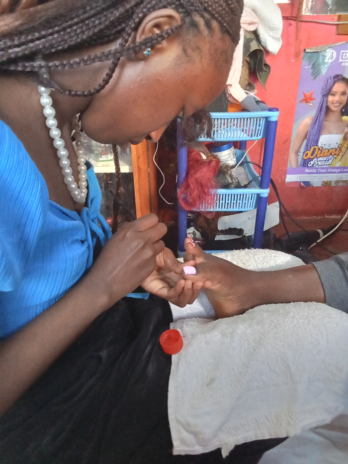 The image depicts an indoor scene in Nyeri, Kenya, likely a beauty salon, featuring two individuals. An adult female with braided hair, wearing a white pearl necklace and a light blue ribbed top, is performing a pedicure. She is applying light pink nail polish to the toenails of a client's right foot, holding the foot with her left hand. The client's foot rests on a white towel. A small bottle with an orange cap, containing nail polish, is positioned on the surface below. The background features a red wall with a poster advertising "Diani Braid," depicting a woman with braided hair. A three-tiered blue plastic shelving unit against the red wall holds various beauty supplies, including bundles of red and brown hair extensions. Electrical wires are visible near the shelving unit.