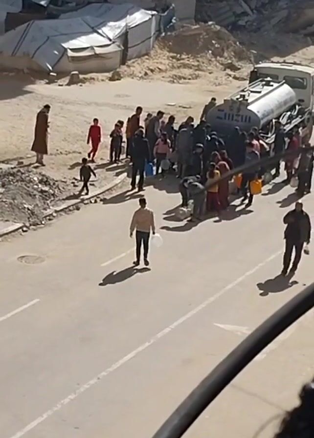group of people gathered around a water truck on a street. The truck is silver and has Arabic writing on the side. People are carrying containers, possibly to collect water. The background shows damaged buildings, suggesting the video was taken in an area affected by a disaster or conflict. The street is paved with white lines and a manhole cover. Several individuals are walking in different directions on the street. The video is shot from an elevated position, likely from a nearby building, looking down on the scene.