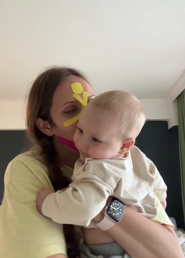 woman holding a baby. The woman is wearing a yellow shirt and has yellow and pink tape on her face. The baby is wearing a beige sweatshirt and grey pants. The woman is holding the baby close and kissing it on the head. The baby is looking at the camera and smiling. The room is brightly lit and has a dark grey wall.