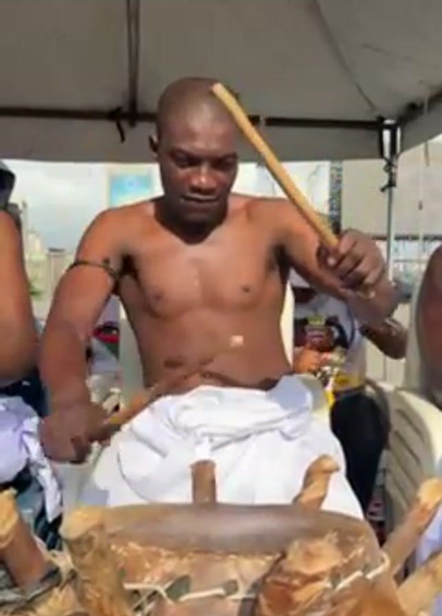 A medium, full-frame shot reveals a shirtless Black man playing a wooden drum. He sits on a white plastic chair, wearing a white cloth tied around his waist. He uses two wooden sticks to strike the drum’s surface, his expression shifting between concentration and brief smiles. Other people, some in white attire, are partially visible in the background. The scene appears to be under a white tent, with urban buildings visible in the distance.