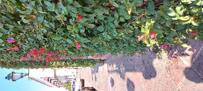 A street lined with lush green bushes and vibrant red and pink flowers. The flowers seem to be growing on top of a wall or hedge. The pathway is paved with stone bricks, with shadows cast by the foliage above. A tall street light stands at the edge of the street. In the background, buildings are visible, along with vehicles.