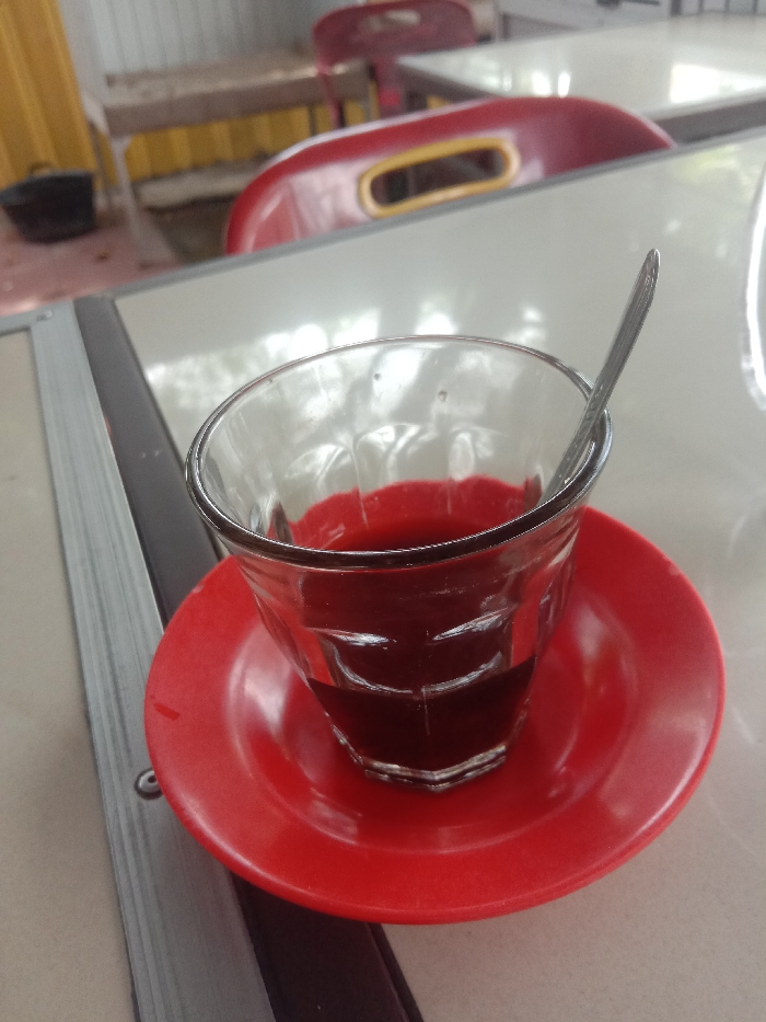 - "A glass of dark liquid, possibly coffee or tea, sits on a bright red saucer with a spoon in the glass" by FM-PQofP2, licensed under CC BY 4.0