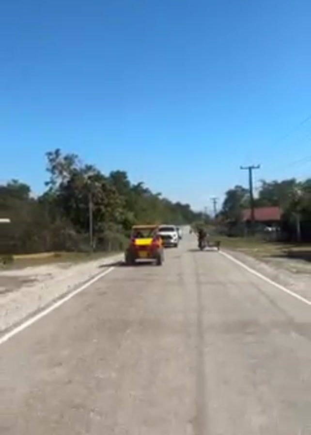 medium shot from a vehicle moving down a paved road under a clear blue sky. In front of the camera vehicle, a yellow off-road vehicle is traveling in the same direction. Further ahead, a white vehicle and a person on a small motorbike are also traveling along the road. The road has trees and utility poles alongside, and a few small buildings can be seen on the right. The road surface appears slightly worn, showing some tire tracks and patches.