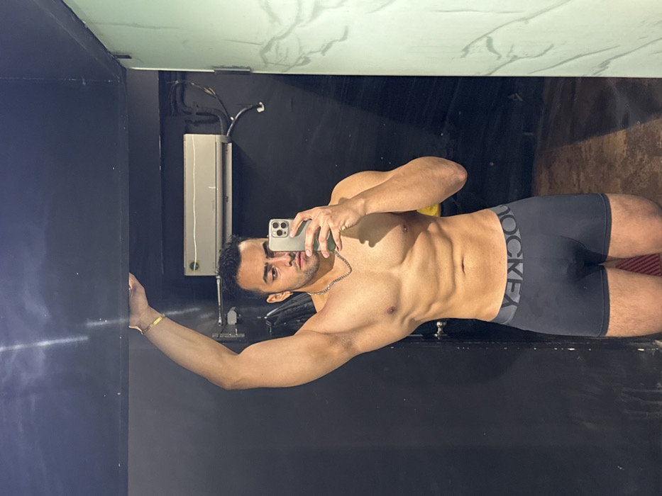 A shirtless man in grey boxer briefs poses in a mirror selfie