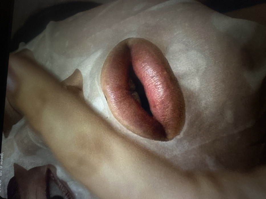 A fleshy, elongated oval structure with a darker inner section rests on a wrinkled, light-colored surface. Beside it, a pale, smooth arm is visible, angled towards the left. Lower left corner is slightly out of focus. The oval form is textured and appears to be reddish-brown. The scene suggests a medical examination or a close-up photograph.