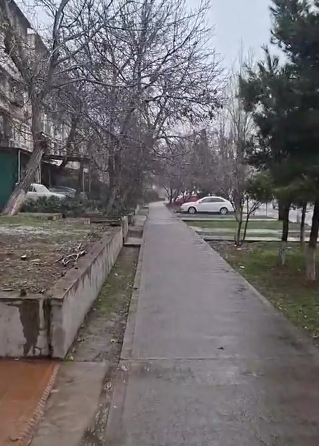 concrete pedestrian walkway with bare trees on both sides. On the left side of the walkway is a raised concrete planter, and on the right side is a patch of grass. In the background, there are apartment buildings and cars parked along the street. The sky is overcast, suggesting a dull or rainy day. The scene is quiet and still.