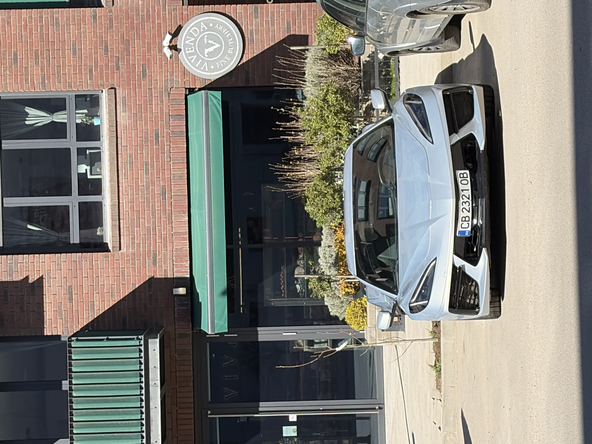 A daytime shot shows a silver car parked on a street in front of a brick building. The building has a green awning above the entrance with black framed glass doors. A sign reads "VIVENDA FINE BUTCHERY" on the building above the entrance. The car's license plate is visible and reads "CB 2321 OB." The building features a window with a white curtain inside. A smaller building is visible on the left. A bush is growing between the building and the car. Part of another car is visible in the upper right corner. The location is Sofia, Bulgaria, based on the license plate.