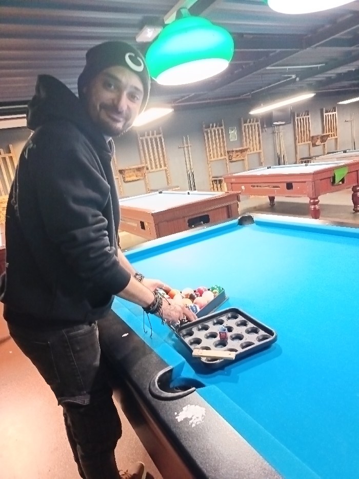 - "In a billiards hall, a person wearing a black hoodie and beanie stands next to a blue pool table" by FM-Fezcd2, licensed under CC BY 4.0
