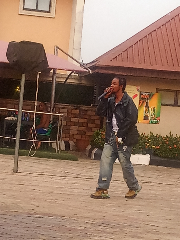 A man wearing a dark denim jacket, white t-shirt, and baggy ripped jeans walks across a paved area while singing into a microphone. He also has a black bag over his shoulder and is wearing brown work boots. Behind him, under an awning, a person sits at a table. In the background, there's a building with a red roof and a sign on the wall. Vegetation decorates the space near the building.