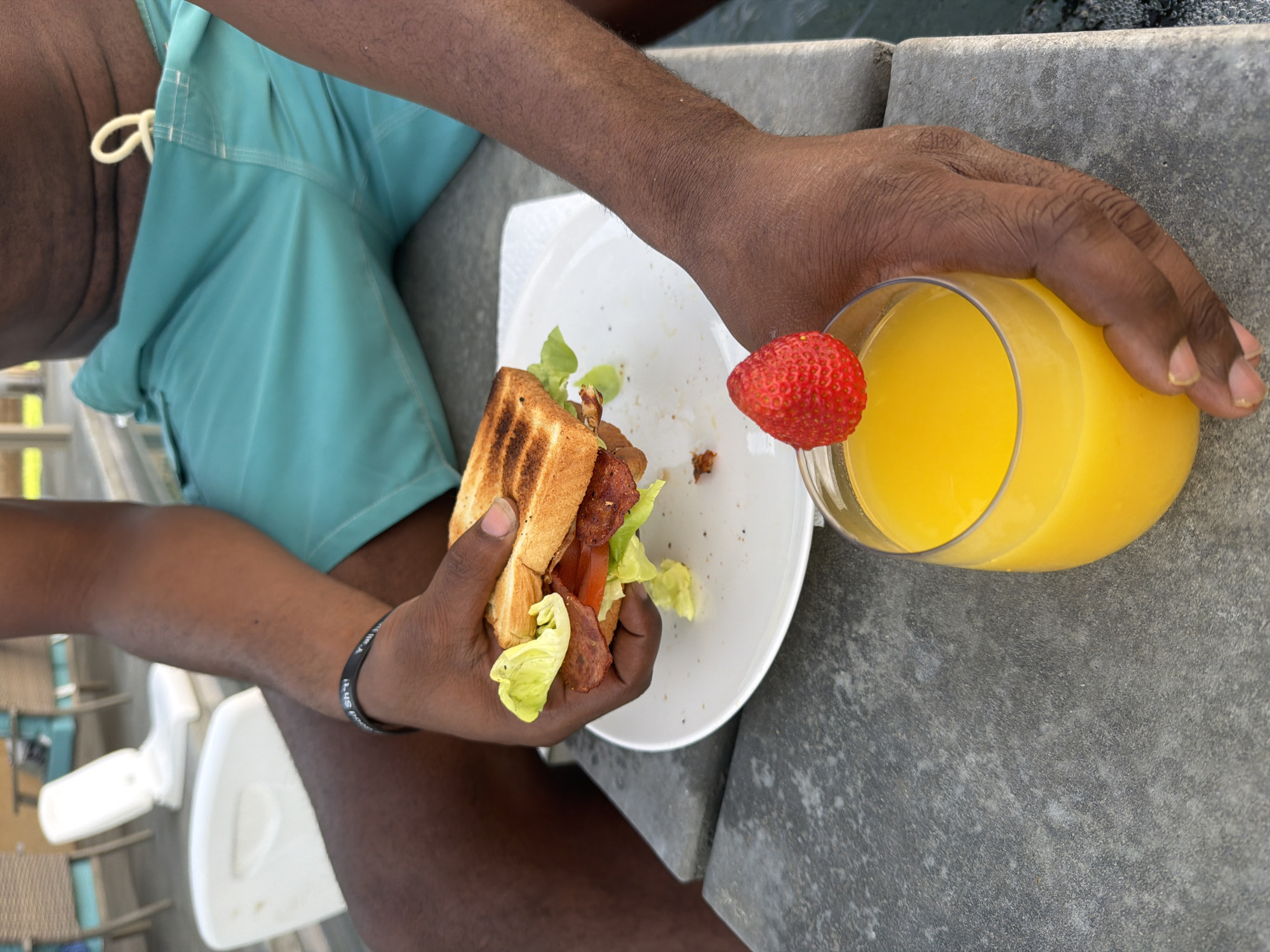 A person holds a sandwich and a glass of orange juice. The sandwich appears to be made of toasted bread, bacon, lettuce, and tomato. A strawberry is perched on the rim of the glass. The person wears light-blue swim trunks and a black wristband. The scene takes place outdoors, with a gray stone surface beneath the food and beverage. A white chair is partially visible in the background.