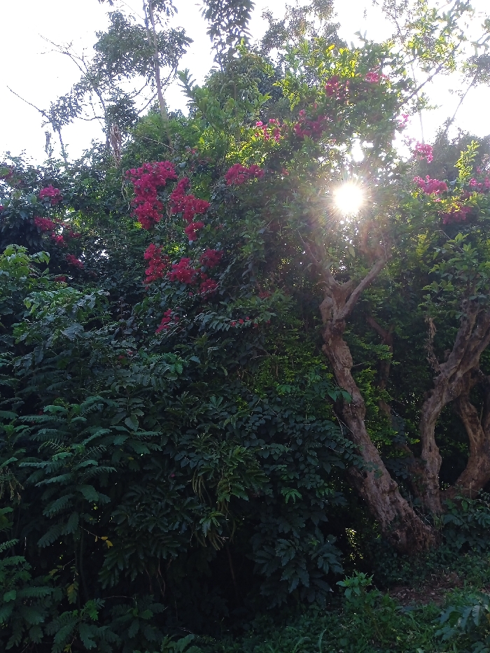 The image displays a dense natural landscape within the city of Embu, Kenya. Strong backlighting is evident from a distinct sunburst positioned in the upper-right center, largely obscured by green foliage, creating lens flare. Multiple clusters of vibrant pink bougainvillea flowers are interspersed among extensive green leaves across the upper and central areas. On the right side, gnarled tree trunks with visible bark texture are present, rising from dark green undergrowth that fills the lower half of the scene. No individuals, animals, or artificial structures are visible.