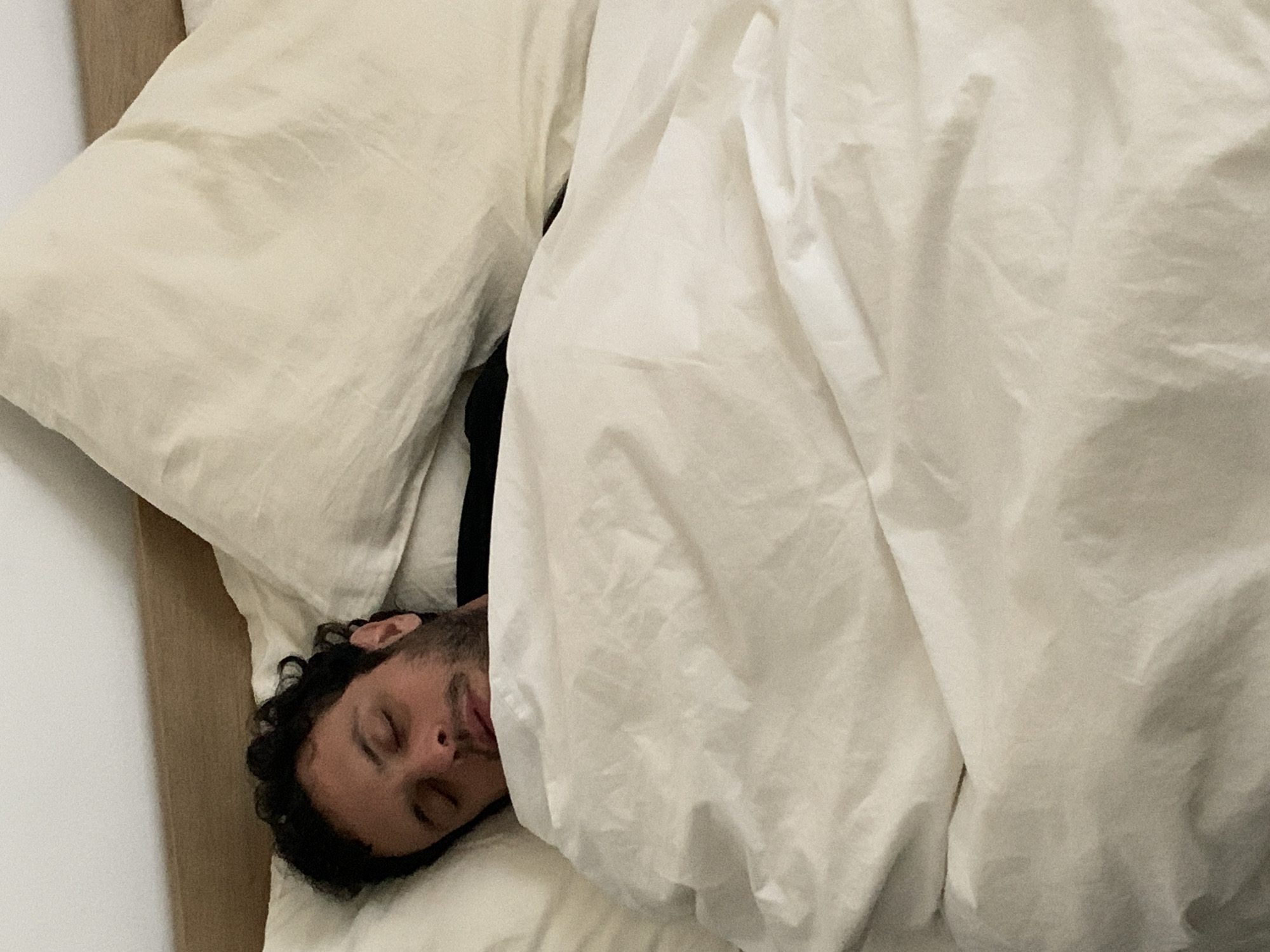 A man is asleep in bed under a white duvet and next to a large beige pillow. He has dark, curly hair. The scene is indoors and no elements indicate it is located in Tel-Aviv, Israel.