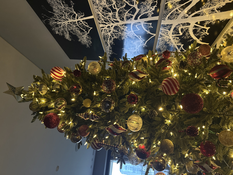 An artificial Christmas tree, illuminated by numerous warm-white lights, stands indoors in Mexico City, Mexico