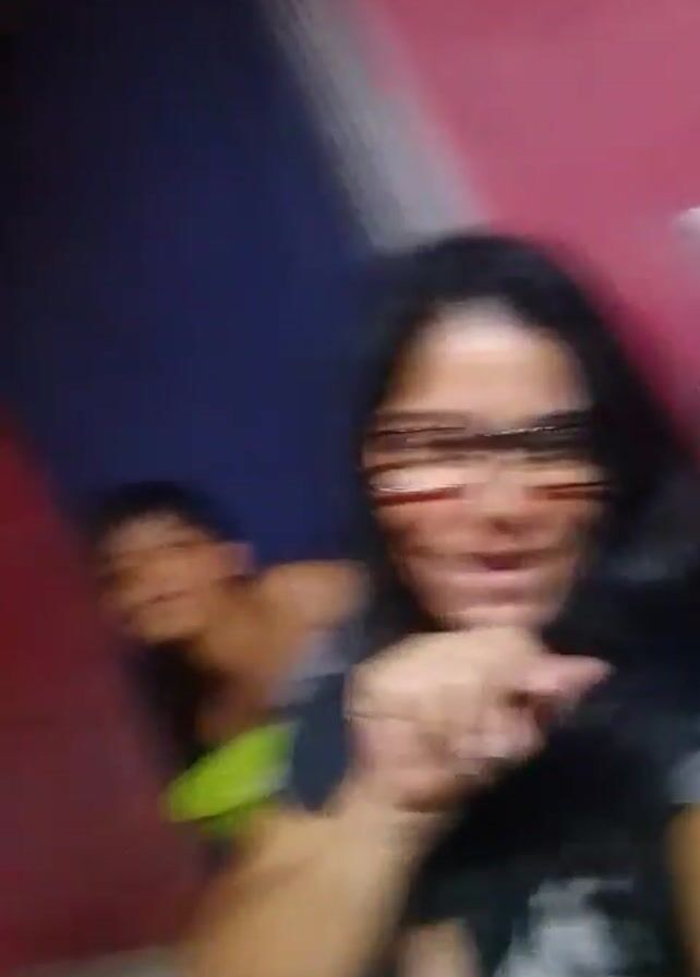 A woman with long black hair and glasses smiles and waves at the camera. She is wearing a gray shirt. Behind her to the right is a young girl wearing a headband with ears. Behind her to the left is a young shirtless boy holding a green bowl. The woman says "Saluda papi," and the boy yells "Hola." The background consists of a partially visible blue curtain, a pink wall, and a shadow on the blue curtain.