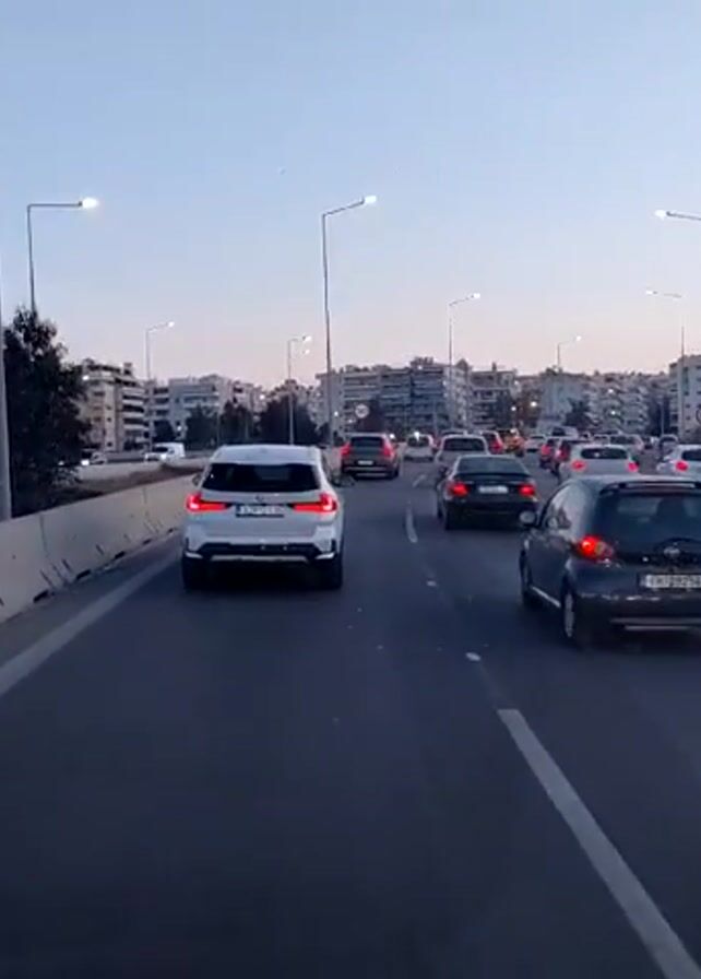 car driving on a highway with moderate traffic in an urban environment. The highway has multiple lanes and is separated by concrete barriers on the left. Numerous cars are visible, including a white SUV in the front, followed by a black sedan and a dark hatchback. Buildings and streetlights line the horizon, suggesting the scene is set within a city. The sky is clear with a light blue hue, possibly indicating dusk or dawn. There is a traffic sign visible indicating a speed limit of 50. The video is shot from the perspective of a driver inside a car.