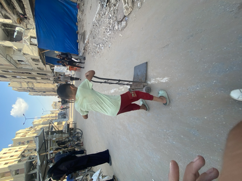 The image depicts a street scene in al-Qarara, Palestinian Territory, under a clear blue sky with a single white cloud. In the foreground, a young male child, viewed from behind, wears a light green t-shirt, red trousers, and light blue slip-on shoes, pushing a dark metal hand truck with a flat base and two wheels. To the immediate right of the child, the paved street surface gives way to debris, including concrete chunks and dirt, next to a significantly damaged multi-story concrete building with exposed structural elements and broken window frames. Further down the street on the right, a structure is covered by a large blue tarp. On the left side of the street, multiple multi-story buildings line the thoroughfare, some appearing less damaged. A makeshift market stall with a tarp roof is visible on the left, near which a person wearing a black abaya stands, and several bicycles are parked. Numerous other individuals are visible walking or standing further down the street in the midground and background. Streetlights are positioned overhead. A human hand and forearm are partially visible in the lower left foreground, indicating the perspective of the camera operator.