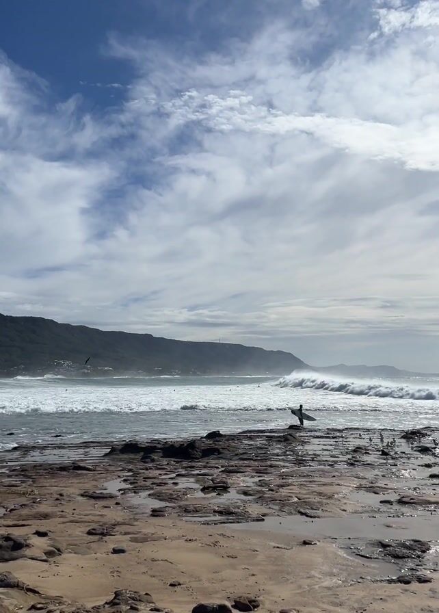 beach with a surfer carrying a board standing on a rocky outcrop in the foreground. In the background, large waves are crashing onto the shore, and a green, mountainous landmass stretches across the horizon. The sky above is partly cloudy with patches of blue. The beach appears to be a mix of sand and exposed rock, with small pools of water scattered around. The lone surfer is the only visible person besides those further out in the water. The overall impression is one of a moderately windy day at the beach, with a focus on the surfer's potential interaction with the waves.