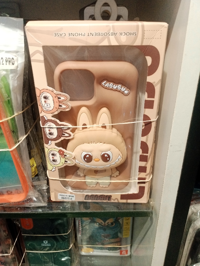 - "A light brown "SHOCK ABSORBENT PHONE CASE" featuring a 3D "Labubu" character design is prominently displayed in its retail packaging on a shelf" by FM-MMPOs1, licensed under CC BY 4.0