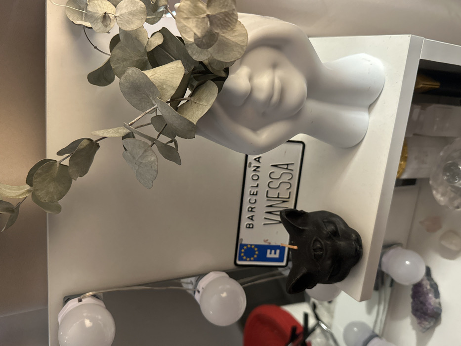 A white shelf displays a human head vase holding dried eucalyptus. A "Barcelona Vanessa" license plate is positioned vertically next to the vase, near a small black cat candle with a toothpick wick. Below, vanity lights line the shelf's edge. Other items, including crystals, fill the shelf's interior. The scene is bright and clean.