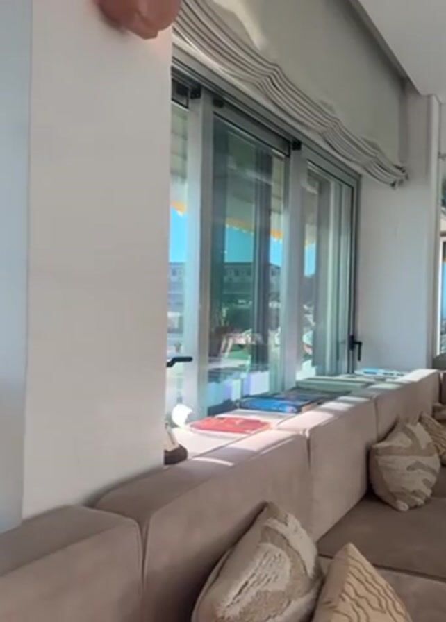 bright, airy room with a large window overlooking an outdoor scene. The room is furnished with a beige couch adorned with patterned pillows. A series of books are arranged along the back of the couch, serving as a makeshift shelf. The window, composed of three large glass panes, offers a view of a building across a green lawn. A striped valance hangs above the window, and the sky is visible through the glass, suggesting a sunny day. The camera moves slightly, shifting the angle of the view. A flesh-toned sculpture is visible at the top of the frame.