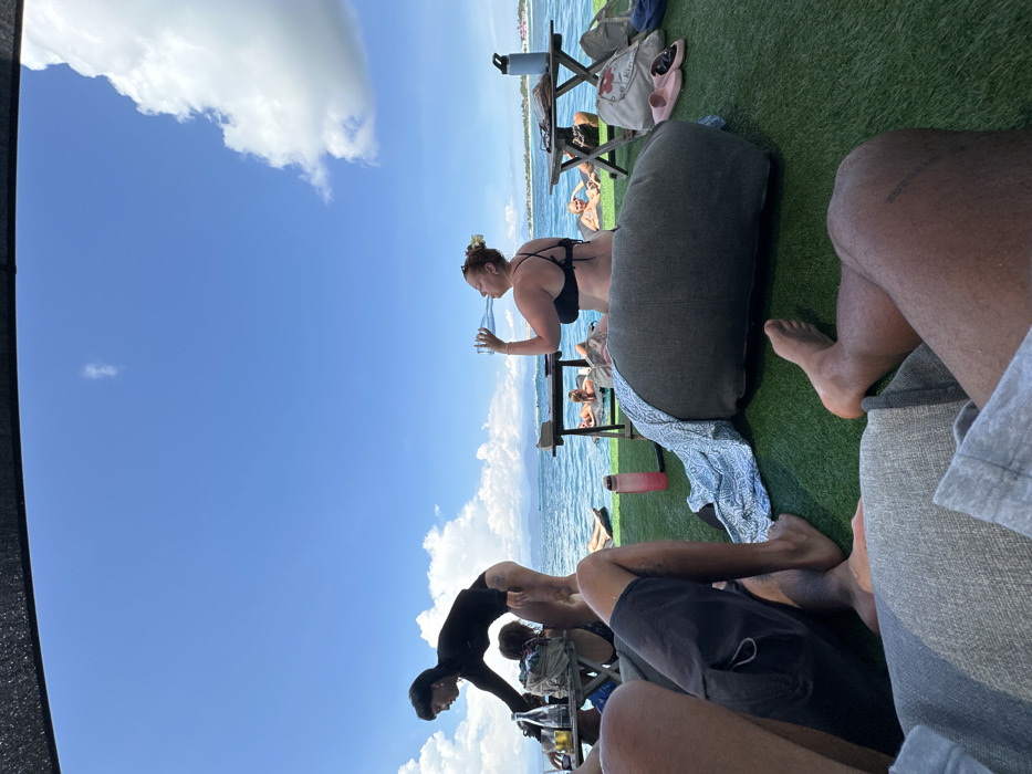 A group of people relax on what appears to be a boat or a deck next to the ocean. One woman, dressed in a black bikini, is drinking from a glass. Another person in a black outfit is bending over, possibly stretching. Pillows and blankets are scattered around, and some individuals are lounging in the background. A small wooden table holds drinks and personal items. The sky is blue with fluffy white clouds.