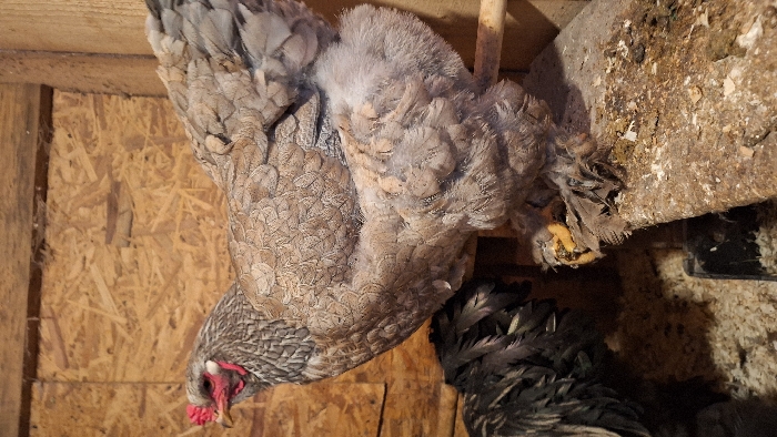 A gray chicken with red wattles pecks downward. Its feathers are patterned in shades of gray. Above, a mass of fluffy gray feathers merges with a dirty, textured surface. A black chicken is visible at the bottom. The chickens are in a wood interior, with wood panels and framing visible in the background.