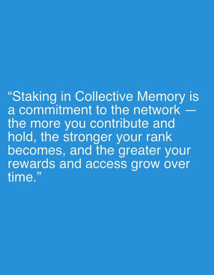 The image displays white sans-serif text positioned against a solid, bright blue background. The text reads: "Staking in Collective Memory is a commitment to the network — the more you contribute and hold, the stronger your rank becomes, and the greater your rewards and access grow over time." No people, discernible objects, actions, or interactions are depicted within the visual frame. The image is located in the city of Ruse, Bulgaria.