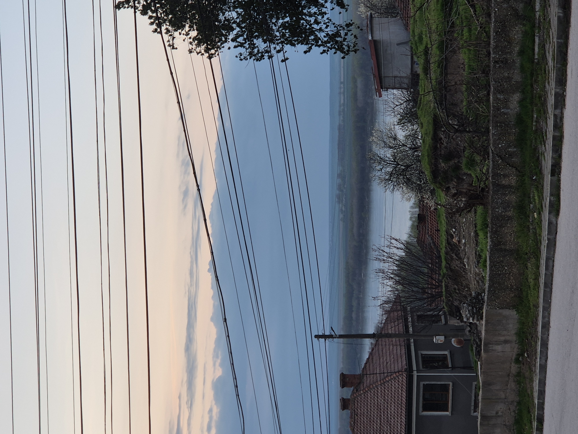 The image depicts a view in Tutrakan, Bulgaria, showing a landscape with a layered perspective. In the foreground, there are power lines running across the left side. Beyond the power lines is a scene with a mix of sky, land, and water, possibly a river or large body of water in the distance, with a muted color palette. On the right side, there is a street with a sidewalk, a low stone wall bordering a raised grassy and rocky area, and the tops of some buildings and trees. The overall setting suggests a rural or suburban area.