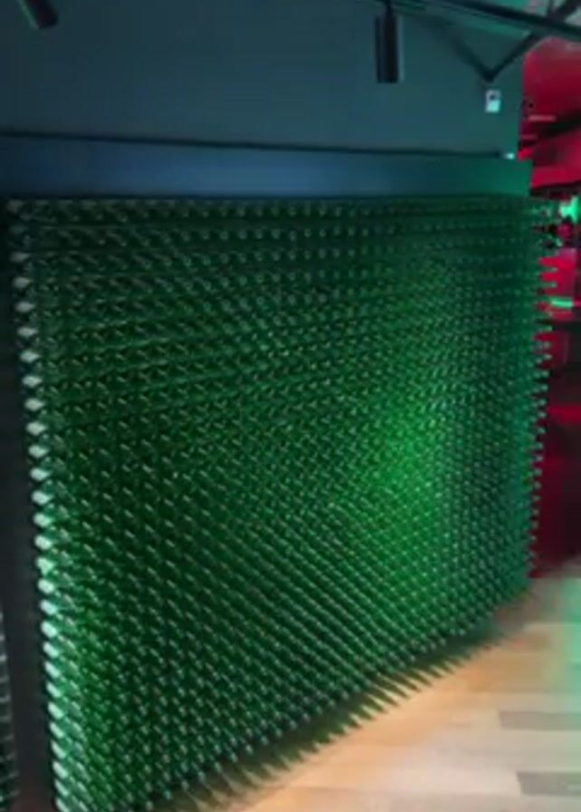 A square, wall-like installation of green bottles is shown on a wooden floor with light reflecting off the walls to create a five-pointed star in the center and other abstract designs. The installation is lit from behind by green lighting. The wall behind is a dark gray with spotlights mounted on the ceiling. There is ambient music playing.
