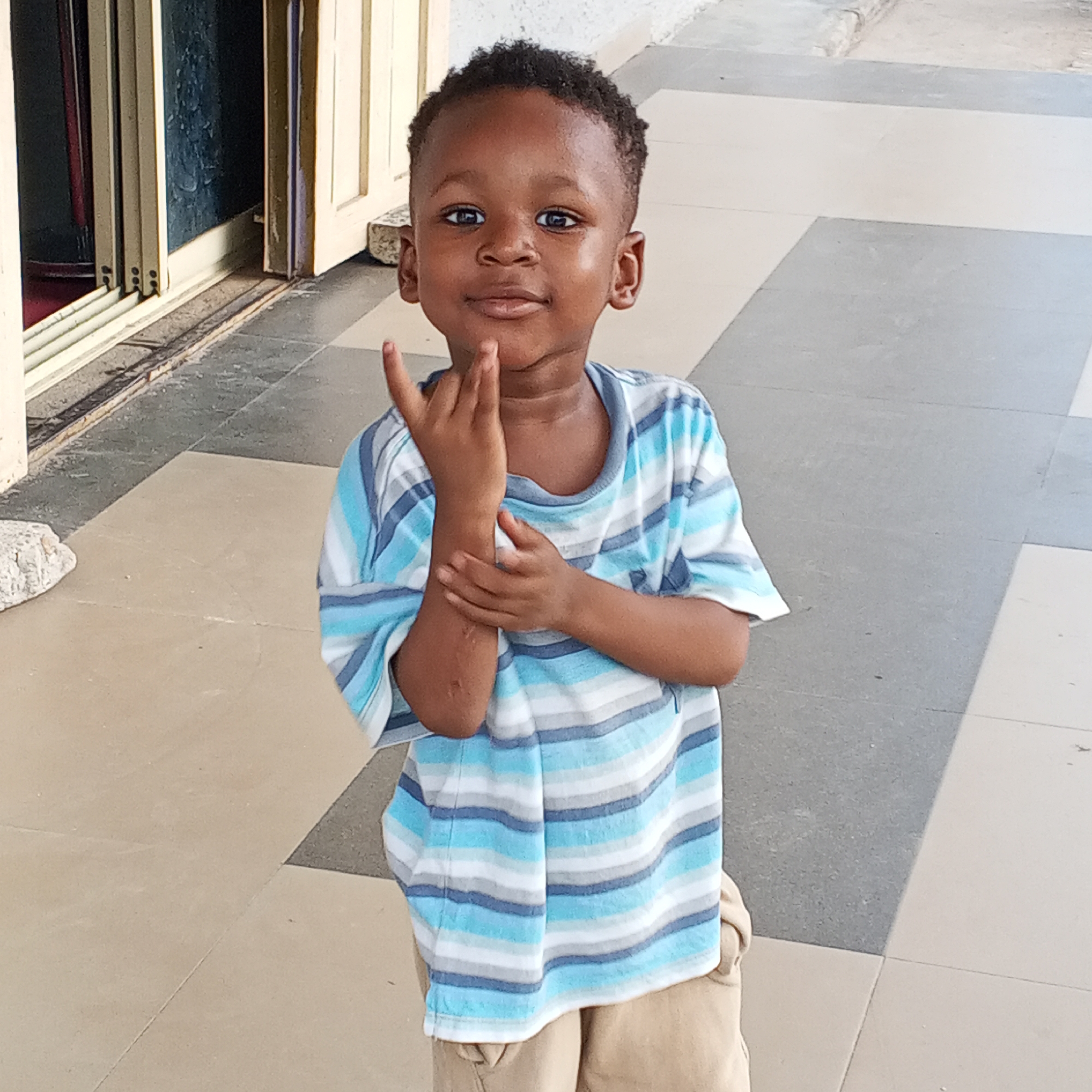 A young, dark-skinned male child is depicted standing on a tiled surface, facing the viewer, in Adankolo, Nigeria. The child has short, dark, curly hair and is wearing a short-sleeved t-shirt with horizontal stripes of white, light blue, and grey, along with tan shorts. He holds his left hand raised near his face, with his index and pinky fingers extended upwards, while his right forearm is crossed in front of his torso, his right hand resting near his left elbow. His expression is a slight smile. The background reveals a building structure with light-colored door or window frames. To the left, a dark red interior or curtain is visible through an opening. The floor consists of large square tiles in alternating shades of light beige and dark grey.