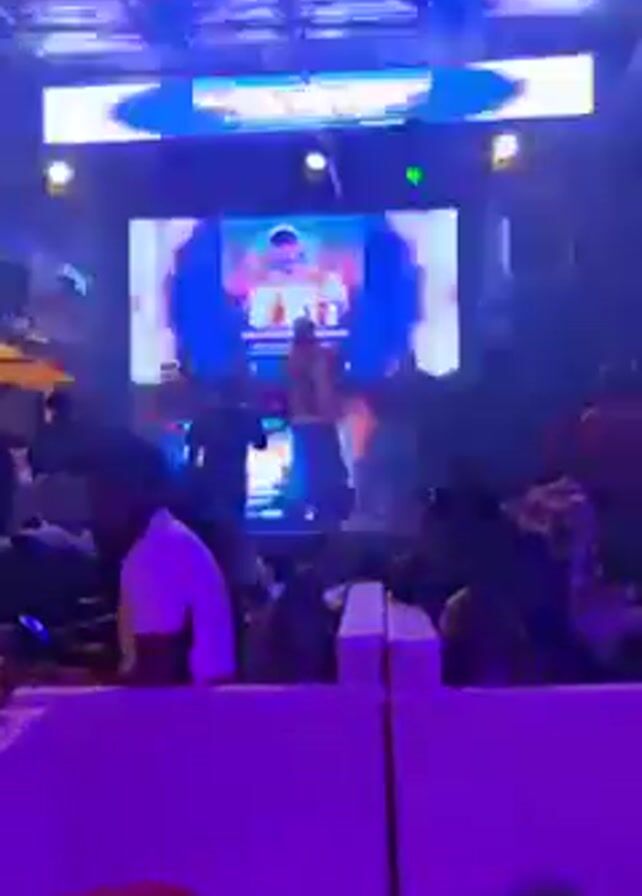 live performance at a nightclub. A male performer is on stage, center frame, illuminated by stage lights, and singing into a microphone. He is wearing a light-colored jacket and dark pants, along with a baseball cap. Behind him, a large screen displays graphics and images, including a close-up of the performer. Other people can be seen on stage, likely accompanying the singer. In front of the stage is a seated crowd, with heads and shoulders visible. Tables and chairs are arranged in the foreground, lit with purple lighting. Overall, the nightclub has a lively atmosphere with colorful lighting and a stage performance.