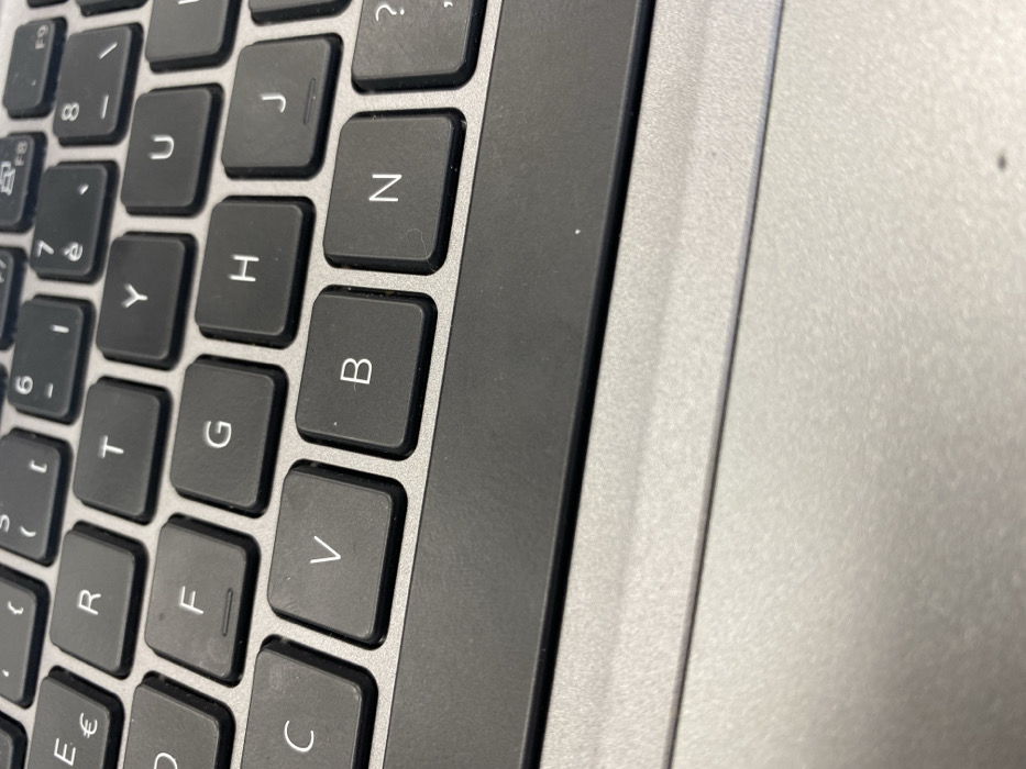 The image displays a close-up, angled view of a section of a laptop keyboard and its adjacent palm rest