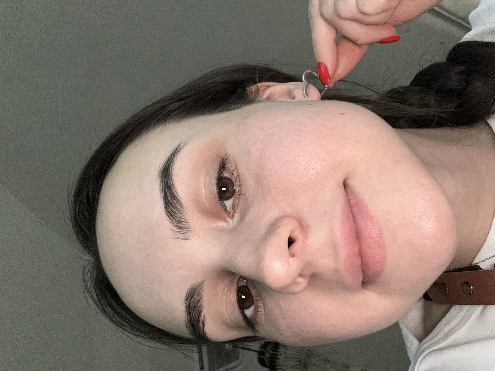 A woman is holding a heart-shaped earring to her ear. The woman has dark hair and brown eyes. Her nails are painted red. She is wearing a white shirt and a brown collar. The location is in the city of посёлок опытного хозяйства «Ермолино», Russia.