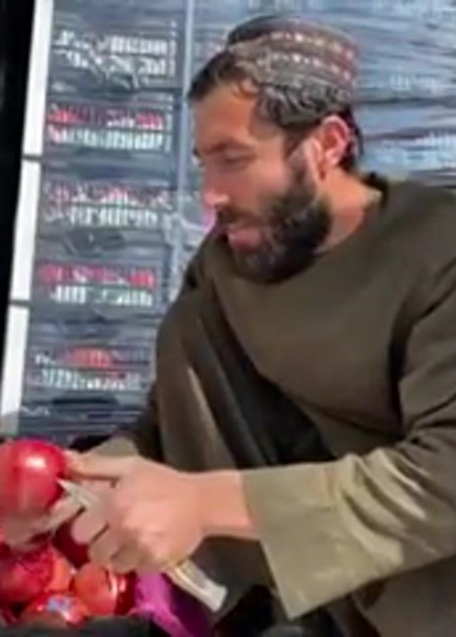 - "A man is squatting in front of crates of pomegranates, cutting one open with a knife" by FM-B5wmg2, licensed under CC BY 4.0