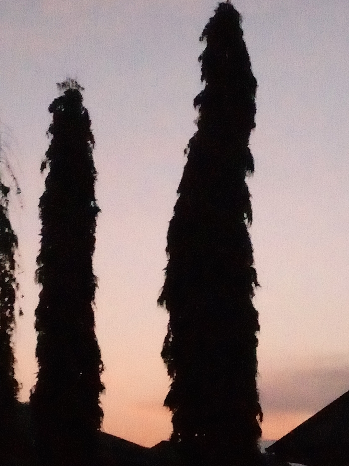 The image depicts three tall, narrow trees, likely columnar in shape, rendered in dark silhouette against a twilight sky