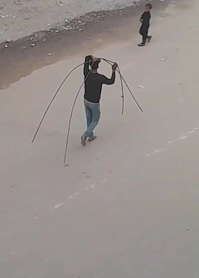 A man in a black shirt and blue jeans is carrying two long, thin, flexible poles, possibly made of metal or plastic, while walking on a dirt surface. A young child is walking in the background. As the camera pans, a building heavily damaged by what appears to be an explosion is visible, with tarpaulins covering some of the debris. Other people are walking near the damaged structure. Another man stands still, placing his hands on his head. The environment appears to be a war-torn or disaster-struck area.